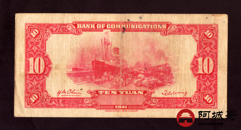 Lot:31 民国三十年 交通银行 拾圆 板子硬7成新