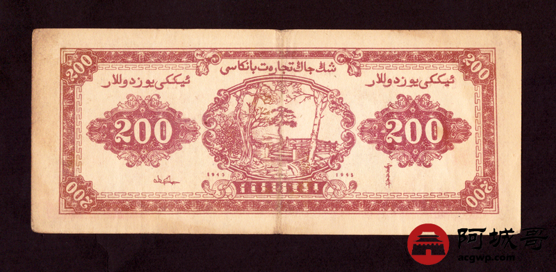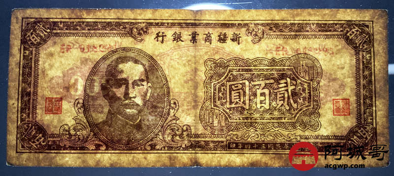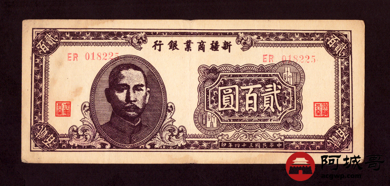 Lot:35 民国三十四年 新疆商业银行 贰佰圆 板子硬8成新