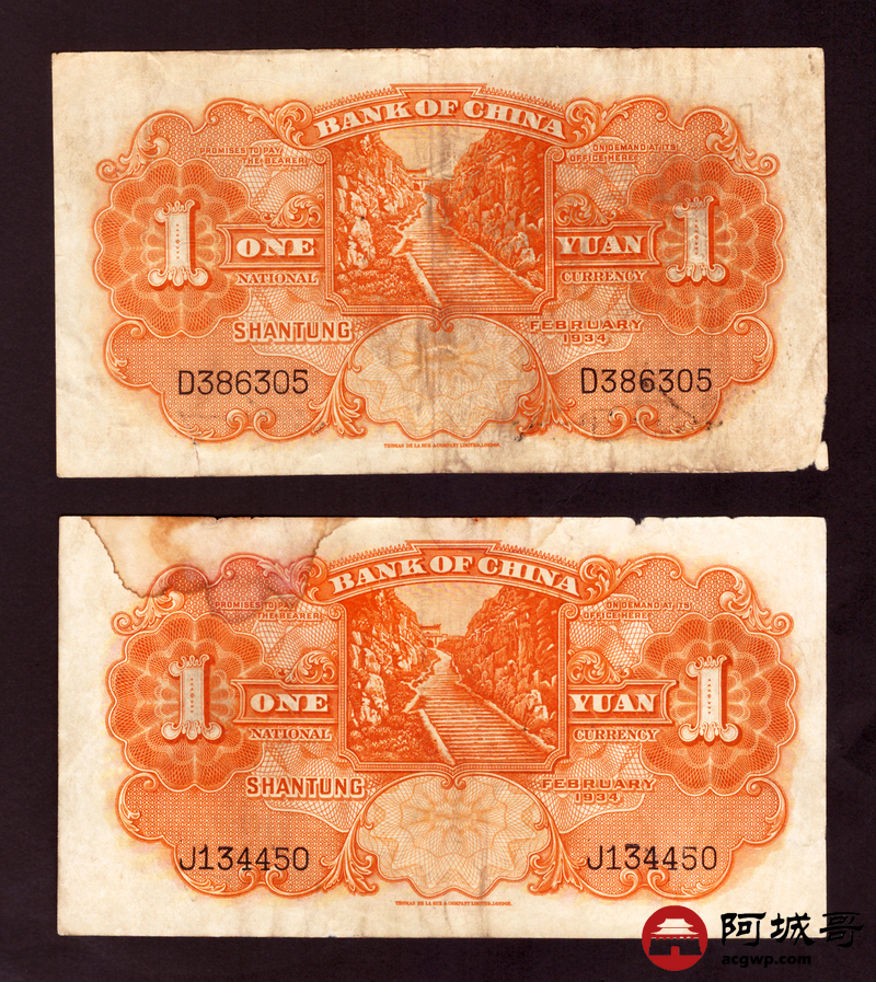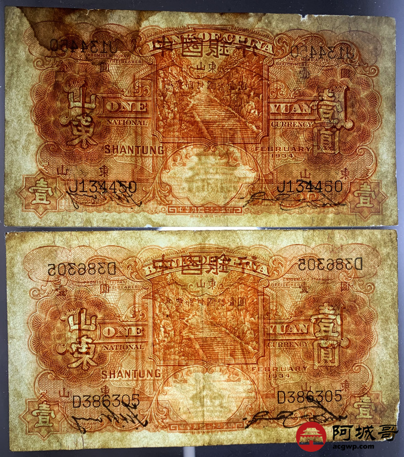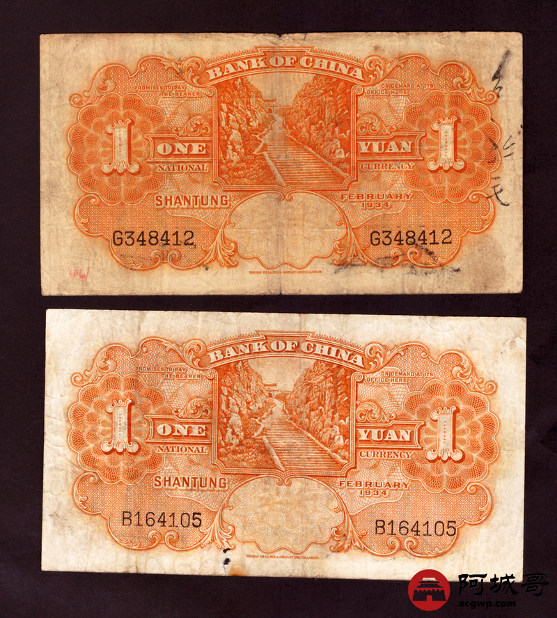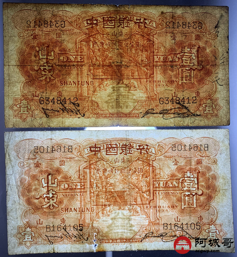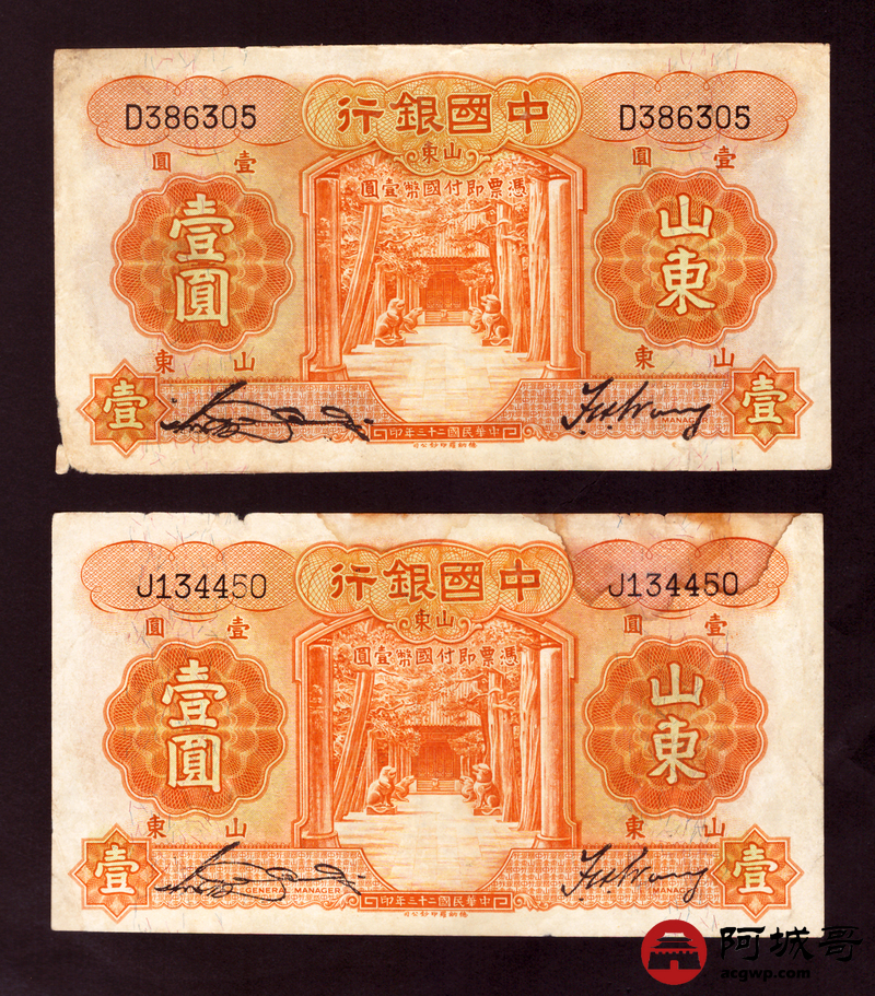 Lot:10 民国二十三年 中国银行 山东地名 壹圆4张 68至69成新