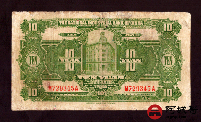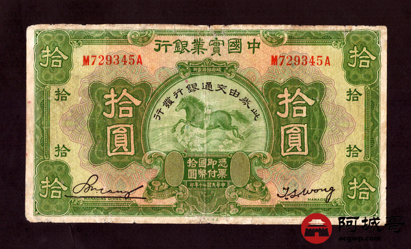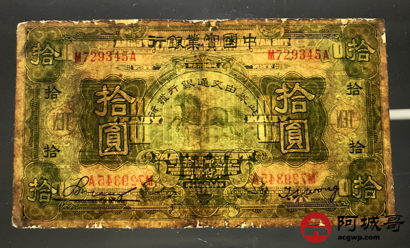 Lot:16 民国二十年 中国实业银行 飞马拾圆 修补65成新
