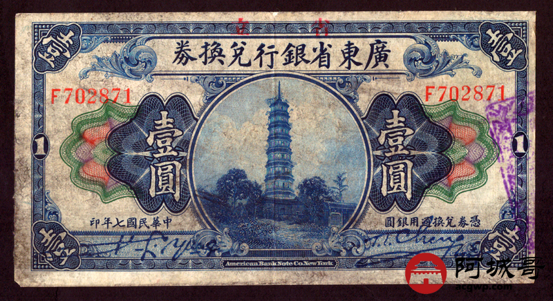 Lot:46 广东省银行兑换券 壹圆 约7成新