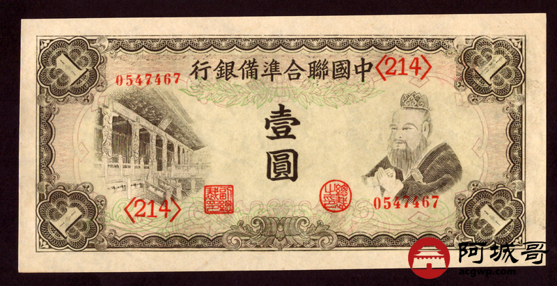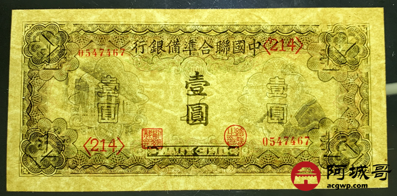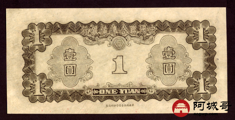 Lot:32 中国联合准备银行 壹圆 针孔 原票95成新