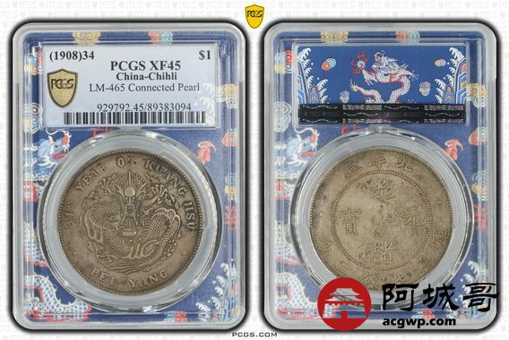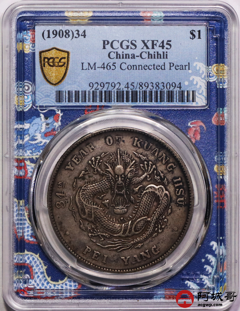 Lot:7 原味老包浆 北洋34七钱二分连珠版 PCGS XF45