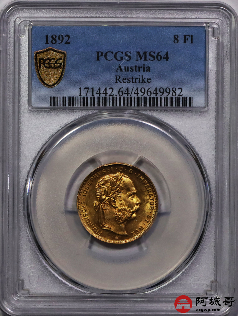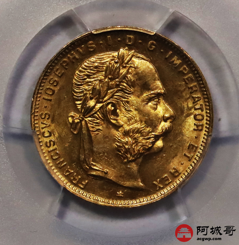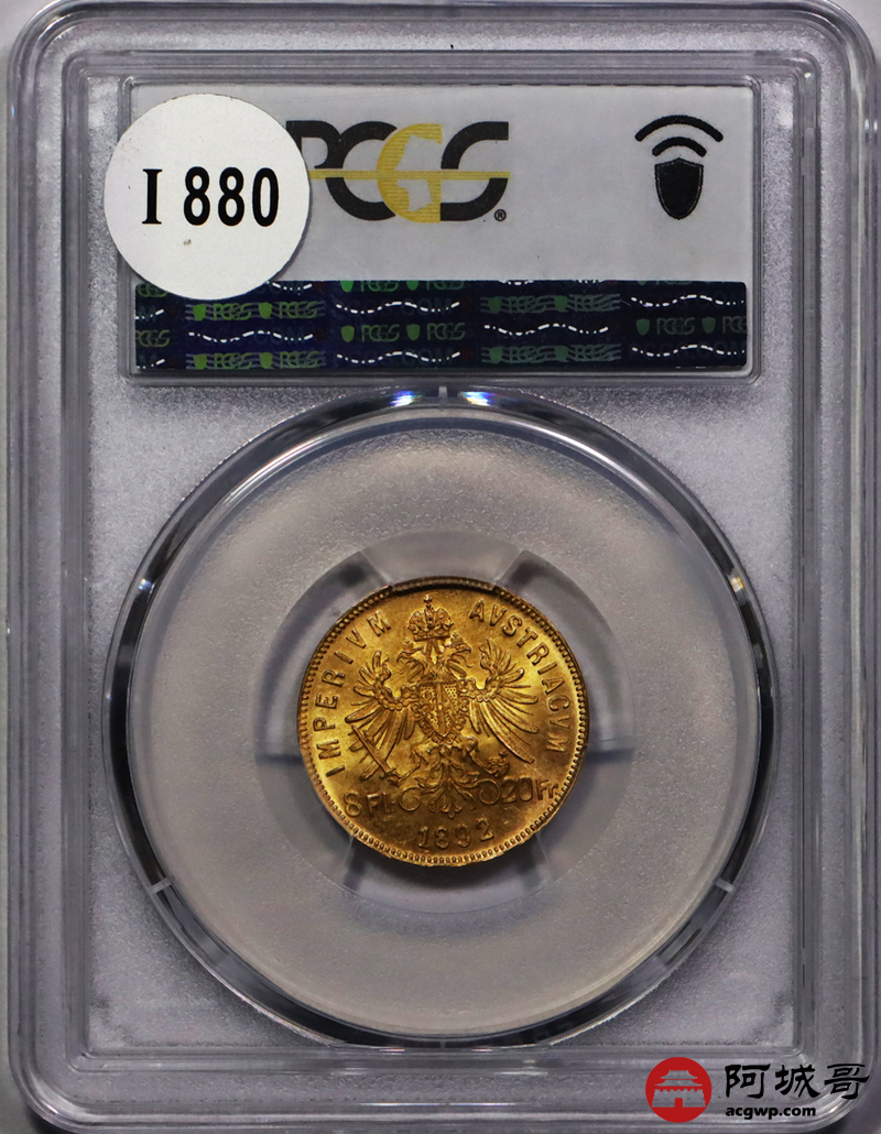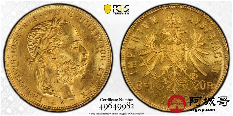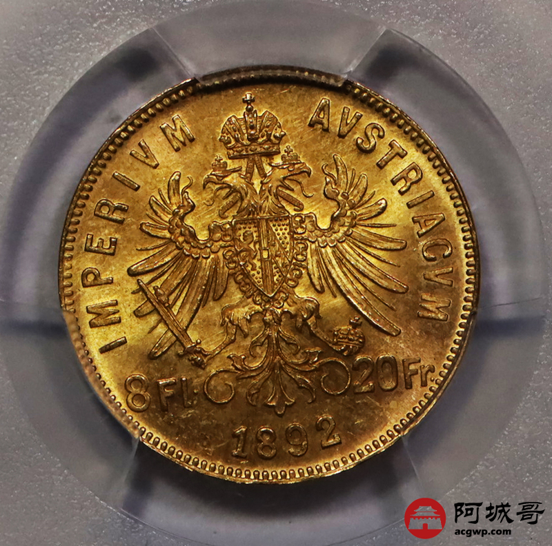 Lot:20 1892年奥匈帝国8佛罗林20法郎金币 PCGS MS66