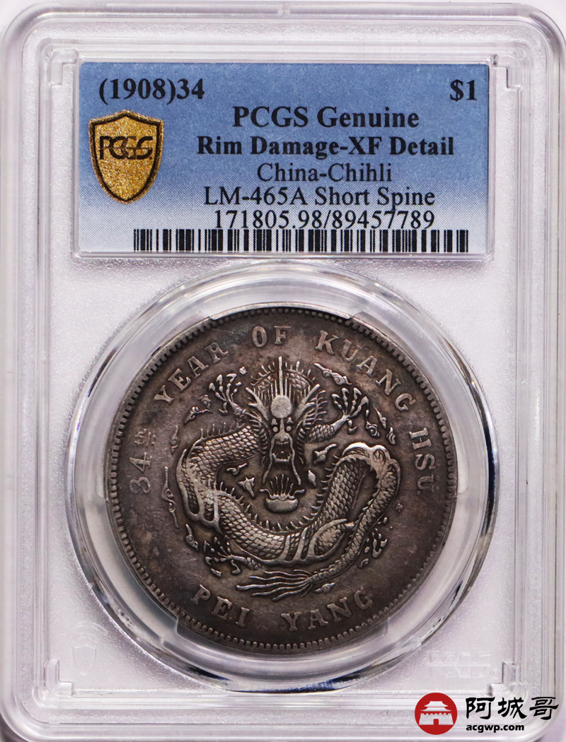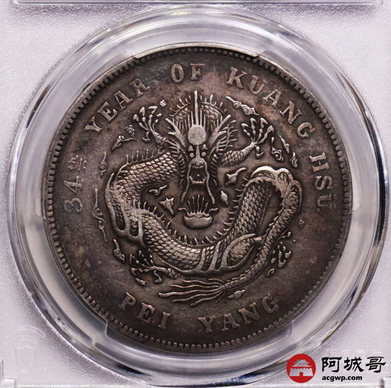 Lot:16 酱彩包浆 北洋34七钱二分 短尾龙 PCGS XF