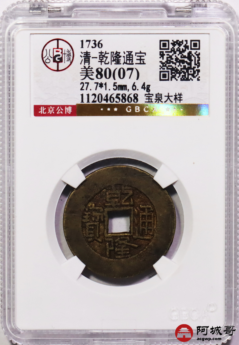 Lot:18 清-乾隆通宝 宝泉大样 公博美80(07)