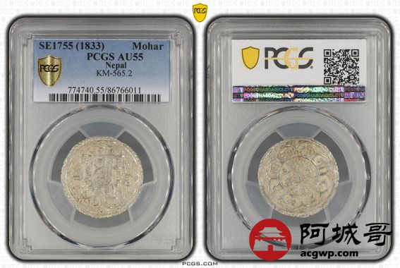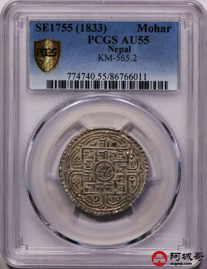 Lot:39 1833年尼泊尔萨哈王朝张嘎银币 PCGS AU55