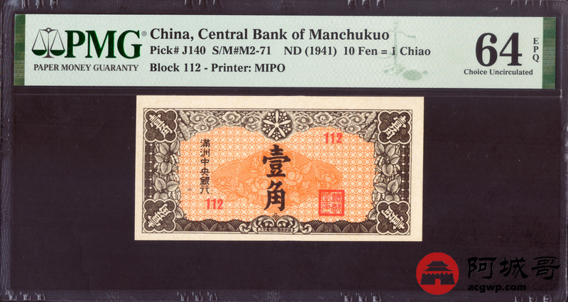 Lot:null 满洲中央银行 壹角 PMG 64EPQ