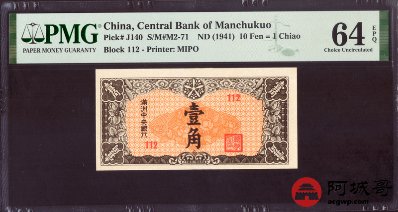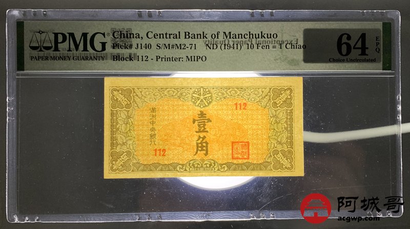 Lot:null 满洲中央银行 壹角 PMG 64EPQ