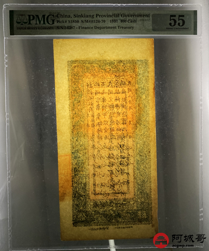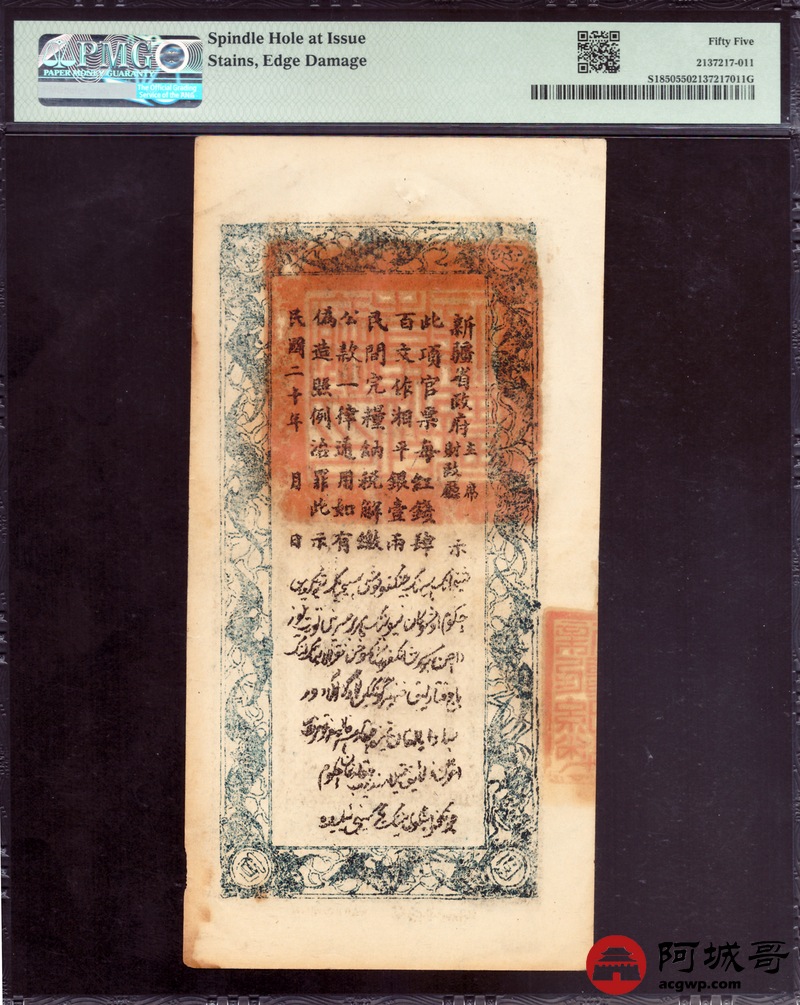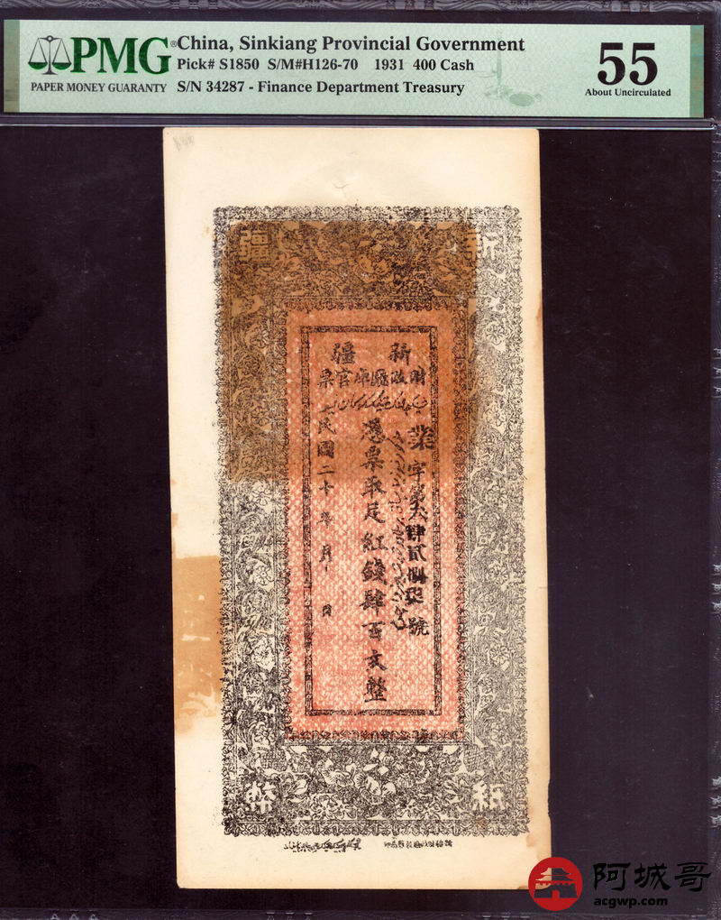 Lot:null 民国20年 新疆财政厅库官票 红钱肆佰文整 PMG 55
